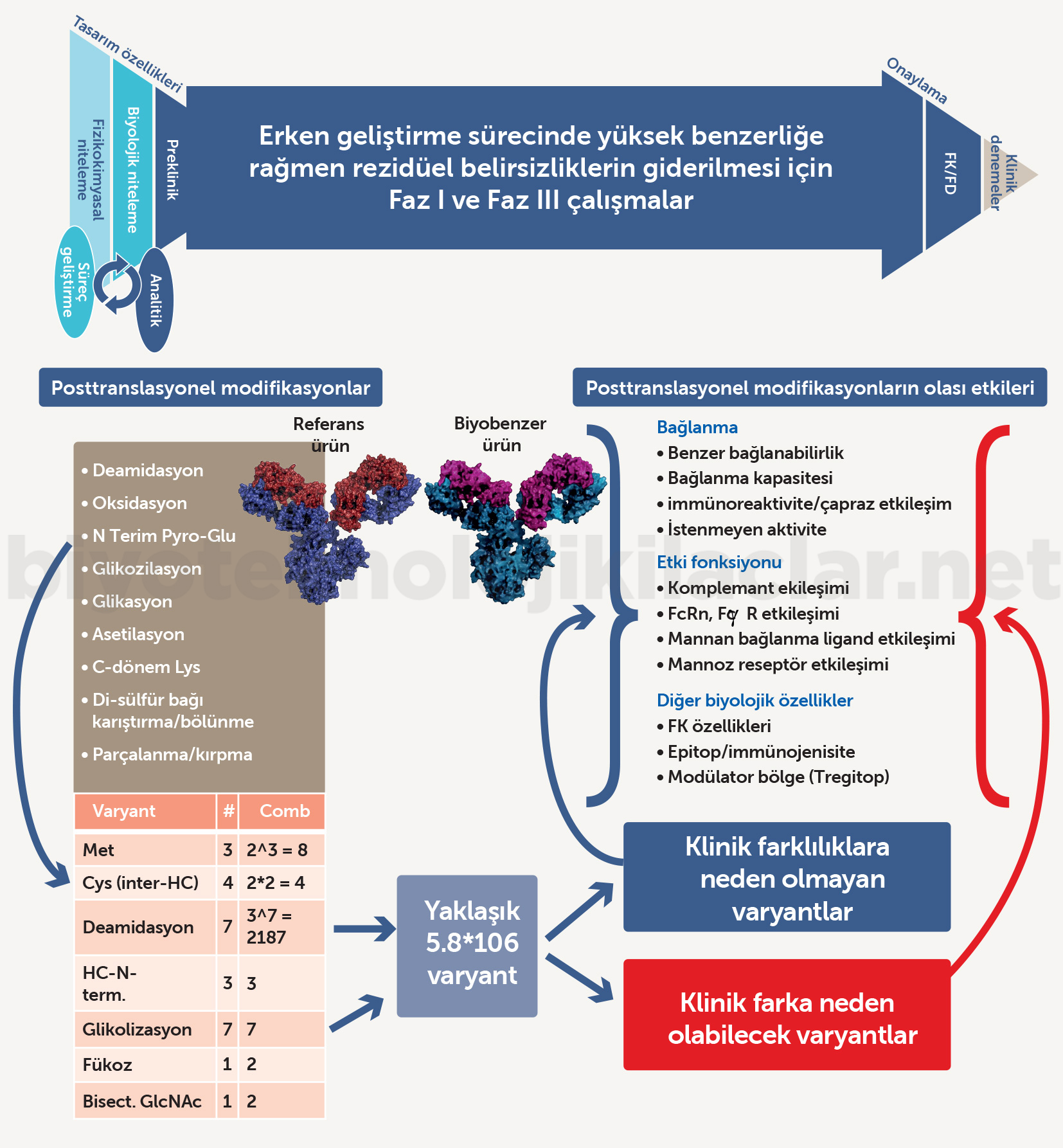 Rekombinant terapötik proteinler E. Coli’den, bitki ve hayvan hücre sistemlerine kadar değişen farklı hücre sistemlerinde fermantasyon yöntemiyle üretilir. Bu rekombinant terapötik proteinlerin moleküler yapıları oldukça karışıktır. Aynıları başka bir üretici tarafından başka bir üretim süreciyle üretilmeye çalışıldığında primer yapıları (amino asit dizileri) birebir aynı olsa da primer yapının maruz kaldığı modifikasyonlarla (-posttranslasyonel- modifikasyon) bu ürünlerin ikincil, üçüncül ve dördüncül yapıları kaçınılmaz olarak farklılaşmaktadır (1,2). Başka bir deyişle asetilasyon, fosforilasyon ve metilasyon gibi posttranslasyonel modifikasyonlar; üç boyutlu şekillenmeler, kıvrılmalar ve alt birimlerin etkileşimi gibi yapısal farklılıklarla beraber birçok fizikokimyasal ve biyolojik özellikleri de farklılaştırmaktadır. Tüm bu farklılıklar farmakokinetik (FK), farmakodinamik (FD), etkililik ve güvenlilik sonuçlarını etkileyebilmektedir. Bununla birlikte, biyoterapötik proteinlerin biyobenzerlerinin geliştirilmesi sürecinde referans ürünün detaylı karakterizasyonuyla birlikte, biyobenzer ürünün yüksek benzerliğinin sağlanması FK, FD, etkililik ve güvenlilik açısından iki ilacın benzer olacağının önemli bir göstergesidir. Bu çerçevede biyobenzer ürünün erken geliştirme süreci en kritik aşamaları kapsamaktadır. Bu süreçlerdeki eksiklikler sonraki aşamalarda değiştirilemez ya da kompanse edilemez. Gerek FK Faz I çalışmalar, gerek Faz III çalışmalar iki apayrı ilacı karşılaştırmaktan ziyade biyobenzer ürünle referans ürün arasındaki rezidüel belirsizlikleri değerlendirmek için yapılmaktadır. Biyobenzer ilaçların etkililik ve güvenliliğini değerlendirmek için yapılan klinik çalışmalar diğer klinik çalışmalardan farklı olan yeni yöntemler değildir. Biyobenzerlere dair klinik çalışmaların temel farkı yeni bir etkililik ve güvenlilik verisi ortaya çıkarmak yerine referans ürüne benzerliğini göstermektir (2,3). Başka bir deyişle biyobenzer klinik çalışmalar benzerliği göstermek üzere yoğunlaşan ve tasarlanan çalışmalardır. Bu çalışmalar benzerlik ve karşılaştırılabilirlik tartışmalarının nihai sonucu açısından tek başına bir temel zemin değildir.