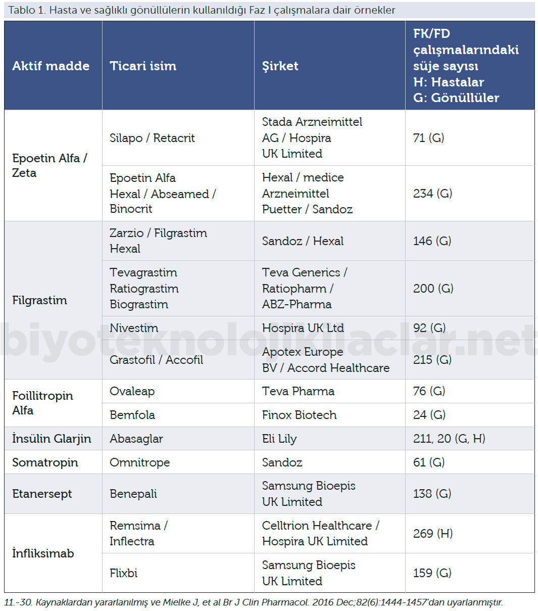 Tablo 1’de görüldüğü üzere zaman zaman aynı referans ürünün biyobenzer çalışmalarında farklı üreticiler, sağlıklı ya da hasta gönüllüleri çalışmaya dahil edebilmektedir. Çalışmaya dahil edilen popülasyonun seçiminin yeterli bilimsel gerekçelerle ortaya konması asıl önemli noktadır. Örneğin insülin glarjin için referans ve biyobenzer ürün ile yapılan çalışmada olduğu gibi sağlıklı gönüllüler ve hasta gönüllüler çalışmaya dahil edilebilmektedir. Biyobenzer ürün ile yapılan çalışmada 211 sağlıklı gönüllünün yanında, European Medicines Agency’s (EMA) Committee for Medicinal Products for Human Use (CHMP) talebi üzerine 20 tip I diyabetli hasta, çalışmaya dahil edilmiştir.