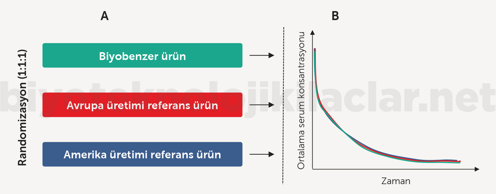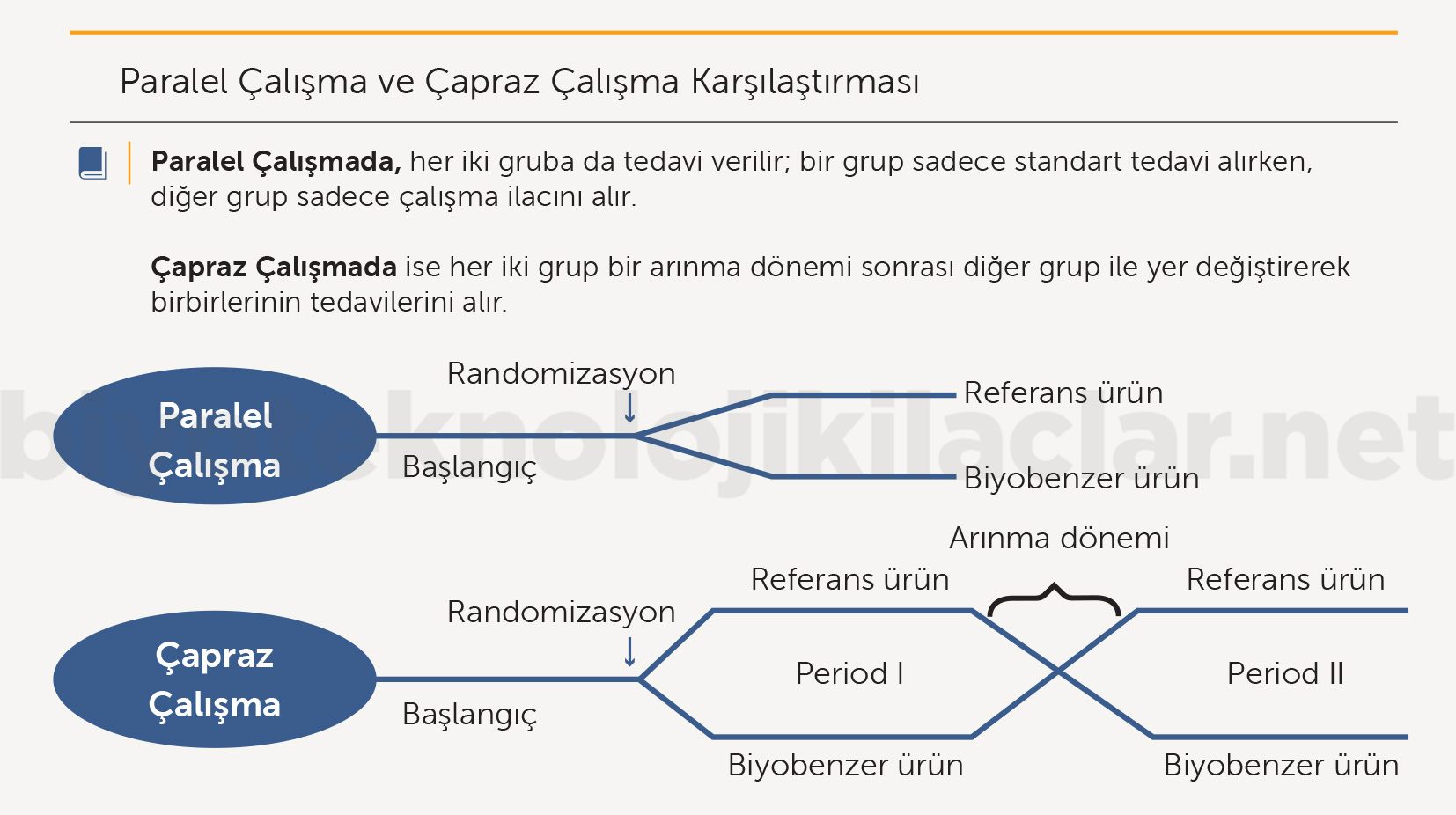 Bu çalışmalarda paralel grup ve çapraz (crossover) tasarımlar kullanılabilir. Bununla beraber, çapraz tasarımlarda gruplarda kullanılan ilaçlar için bir arınma (washout) süresine ihtiyaç vardır (Şekil 3). Yarılanma ömrü çok uzun olan biyoterapötik ürünlerin biyobenzer çalışmalarında arınma süreleri haftalar ve aylar alabilir. Birçok hastalıkta bu bekleme süreleri tedavi süreci için kabul edilemez ve çapraz çalışma tasarımı yapılamaz (2,4).