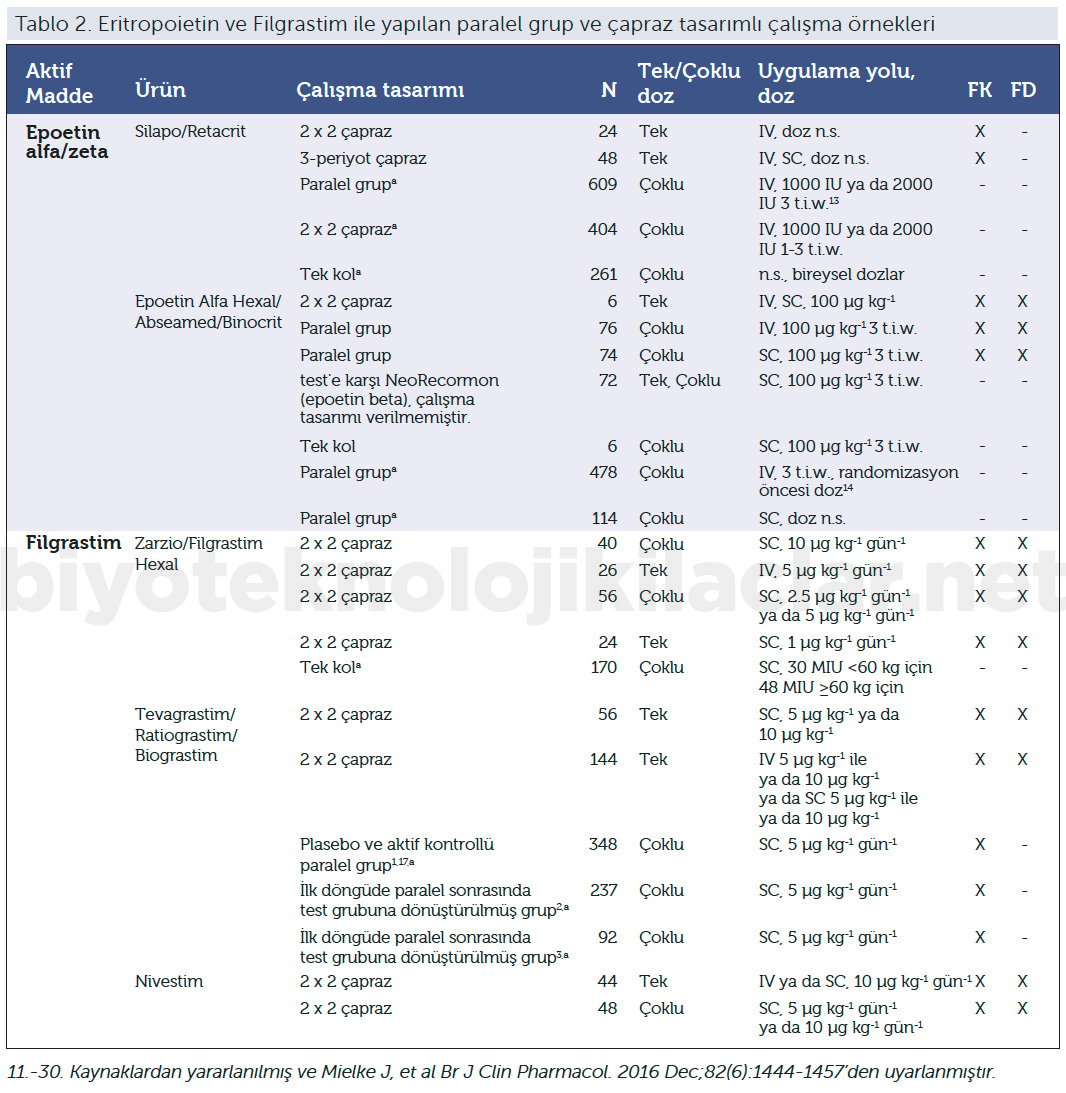 Filgrastim içeren iki farklı biyobenzer ürünün iki ayrı çalışmasında ise CHMP’nin talep ettiği %80–125’lik sınırlarında ve %90 güvenlik aralığında denklik kriterleri sağlansa da AUC0– 32 ve AUC0–∞ ölçümlerinin biyobenzer ve referans ürün arasında anlamlı şekilde farklılık göstermesi nedeniyle CHMP bunu yeterli görmemiştir. Üretici başka analizler ve kanıtlar sunmak zorunda kalmıştır. Bu iki örnek biyobenzer çalışmalarının ve onay süreçlerinin keskin kriterlerle değil, aşama aşama bilimsel gerekçelerin ve kanıtların ortaya konmasıyla süregiden dinamik bir süreç olduğunun da göstergesidir (34).