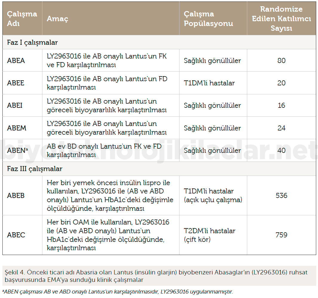 Rekombinant insan insülini ve insülin analoglarının biyobenzerliğini göstermek için öncelikle kalite ve preklinik karşılaştırma çalışmalarıyla referans ilaç ile fizikokimyasal ve fonksiyonel özelliklerin benzerliğinin gösterilmesi gerekmektedir. Bu ön koşul sağlandıktan sonra çapraz tasarımlı, tercihen çift kör, tek doz s.c. uygulamayla gerçekleştirilecek hiperinsülinemik öglisemik Faz I klamp çalışmalarıyla biyobenzer ilaç ile referans ilacın FK ve FD profillerinin benzer olduğunun gösterilmesi, iki ürünün benzer klinik etkililiğe sahip olduğunun temel kanıtını oluşturmaktadır. İnsülin preparatlarının etkililik çalışmalarında sıklıkla kullanılan HbA1c’nin iki insülin preparatı arasındaki klinik olarak anlamlı potansiyel farklılıkları belirlemek için yeterli duyarlılığa sahip olmadığı düşünüldüğünden insülin biyobenzerlerinin referans ürünle benzerliğini göstermek için genellikle Faz III klinik etkililik karşılaştırma çalışmasına gereksinim duyulmamaktadır. Bununla birlikte, klinik güvenlilik çalışmalarının talep edileceği ve bu çalışmalara yeterli sayıda tip 1 diyabetik hastanın dahil edilmesinin bekleneceği unutulmamalıdır. İnsülinlere karşı antikor gelişimi erken bir süreçte beklendiği için genellikle 6 ay süreli bir Faz III çalışmayla biyobenzer insülin ve referans ürüne karşı gelişen antikorların insidansı ve titrelerinin karşılaştırılması yeterli olmaktadır. Biyobenzer insülinin referans insüline benzerliği son derece duyarlı, ortogonal, güncel ve geçerli yöntemlerle yapılan kalite çalışmaları ve FK/FD Faz I karşılaştırma çalışmalarıyla ikna edici bir şekilde gösterilmişse ve iki ürünün safsızlık profilleri ve içerdiği yardımcı maddeler belirli bir endişe uyandırmıyorsa, ruhsatlandırma için yukarda sözü edilen güvenlilik çalışmasına da gereksinim duyulmayabilir (37). Nitekim, insülin glarjin biyobenzeri ürün (LY2963016) referans ürüne biyobenzerliğini kanıtlamak için EMA’ya temel olarak 4 karşılaştırmalı Faz I çalışma sunmuş (ABEN adlı çalışma Avrupa Birliği onaylı referans ürünün Amerika Birleşik Devletleri onaylı referans ürün ile karşılaştırma çalışmasıdır) ve aslında preklinik çalışmalar ve bu 4 Faz I çalışma bazında EMA tarafından biyobenzerliğini kanıtladığı sonucuna ulaşılmıştır. Şekilde yer alan ABEB ve ABEC isimli Faz III klinik etkililik / güvenlilik karşılaştırmalı noninferiorite çalışmaları biyobenzer ürünün FK / FD özelliklerinin tip 1 ve tip 2 diyabetli hastalarda klinik parametrelere nasıl yansıdığını göstererek biyobenzerliğe ilişkin ilave destek sağlamakla birlikte, temel olarak biyobenzer ürünün referans ürünle değiştirilebilirliğine (switch) yönelik gerekli kanıtı sağlamak için kullanılmıştır (Şekil 4) (38).