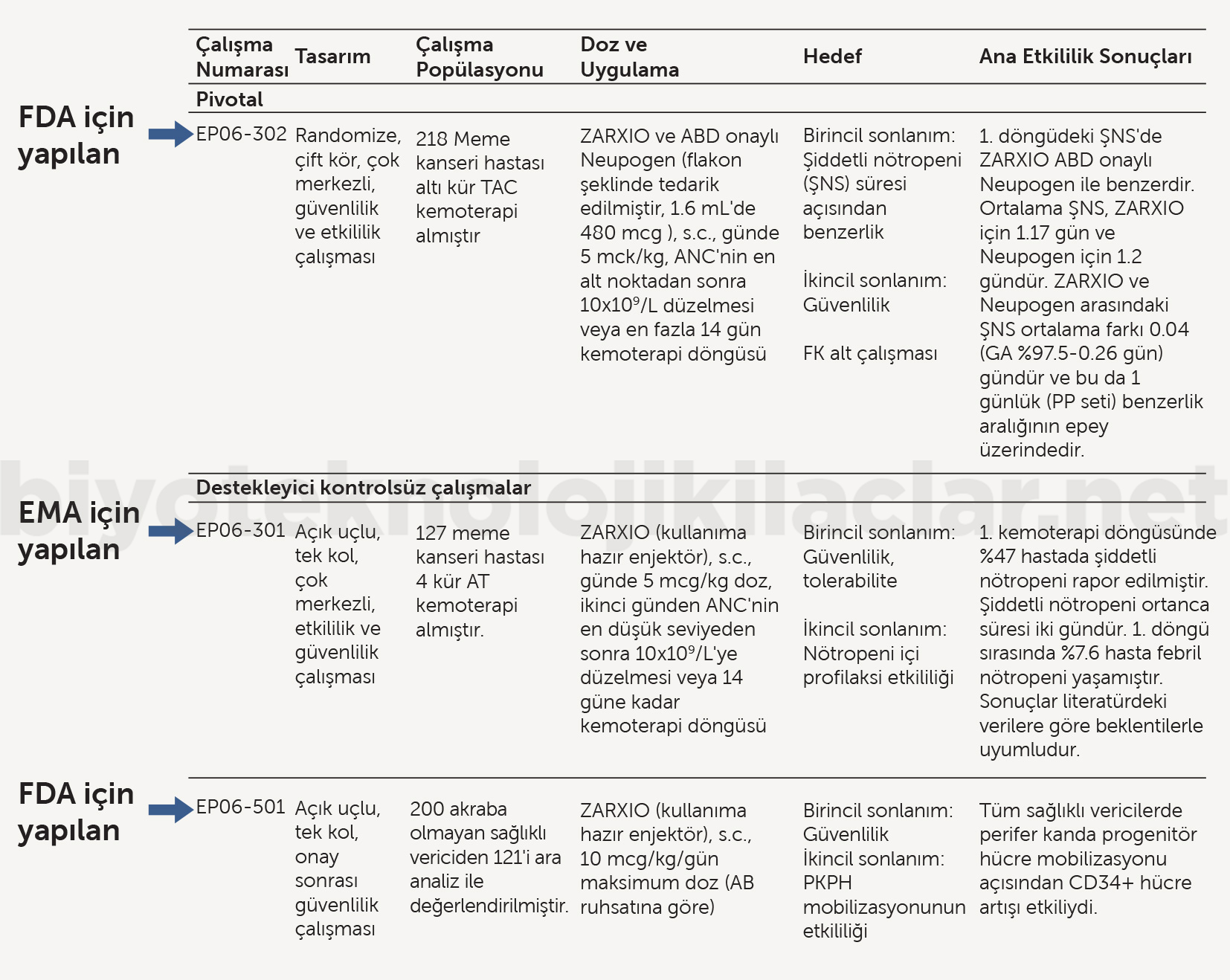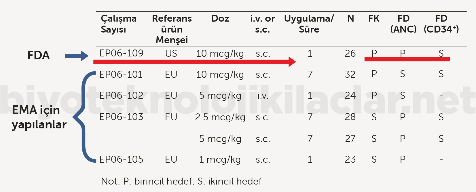Filgrastim EMA, granülosit-koloni stimüle edici faktör (G-CSF) için mutlak nötrofil sayısını, vekil bir FD gösterge / biyogösterge olarak kabul etmektedir. Dolayısıyla mutlak nötrofil sayısı üzerinde biyobenzer ve referans ilaçların benzer bir etki göstermesi, klinik sonlanım üzerinde de benzer etki göstereceklerine işaret etmektedir (40). Filgrastim biyobenzerinin referans ürün ile benzerliğini ispatlamak üzere EMA’ya yapılan başvurusunda preklinik karşılaştırma verileri ile birlikte hem düşük hem yüksek dozları içeren 4 ayrı Faz I FK/FD karşılaştırma çalışması sunulmuştur (Şekil 5). FD karşılaştırma çalışmalarında primer FD parametre olarak rekombinant insan granülosit-koloni stimüle edici faktör için önerilen vekil (surrogate) gösterge olan mutlak nötrofil sayısı, sekonder FD parametre olarak CD34 hücre sayısı alınmıştır. Ayrıca tüm Faz I çalışmalarda güvenlilik karşılaştırması gerçekleştirilmiştir. Bu çalışmalarla biyobenzer ürünün klinik etkililiğinin ve güvenliliğinin referans ürünle benzer olduğuna dair güçlü kanıtlar oluşması sonucunda EMA tarafından firmadan sadece bir Faz III primer güvenlilik çalışmasıyla (Tek kollu-referans ile karşılaştırma yok) gerekli güvenlilik verisini tamamlaması talep edilmiştir (40). Aynı ürünün FDA tarafından biyobenzer olarak onaylanma sürecindeyse mevcut 4 FK/FD çalışmaya ek olarak Amerika Birleşik Devletleri’nde ruhsatlı referans ürün ile Faz I (FK/FD) karşılaştırma çalışması ve biri ruhsatlandırma öncesinde (primer etkililik, sekonder güvenlilik, referans ürün ile karşılaştırmalı), diğeri ruhsatlandırma sonrasında (primer güvenlilik, sekonder etkililik, tek kollu) olmak üzere iki Faz III çalışma gerçekleştirilmiştir (Şekil 6) (41).