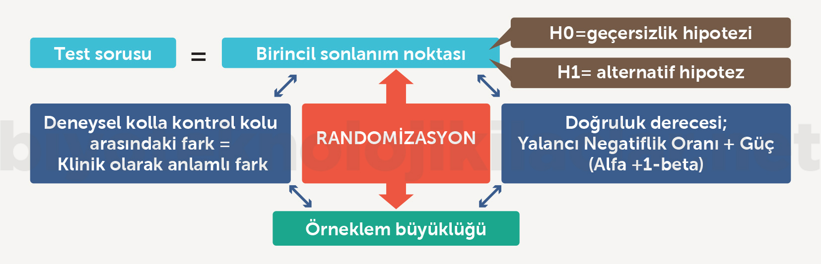 Randomize kontrollü çalışmalar yeni ilaçların etkililik ve güvenliliğinin değerlendirilmesi için altın standart yöntemlerdir. Bu çalışmaların asıl gücü deneysel kolla karşılaştırılan grup arasında bilinen ve bilinmeyen değişkenlerin olabildiğince dengelenmesinden kaynaklanır. Randomizasyonun yapılmadığı ya da yapılamadığı diğer çalışma yöntemlerinde ise sonuçların karşılaştırmalı yorumunu kısıtlayan, değerlendirmede sorunlara neden olan bilinen ve bilinmeyen değişkenler arasında dengesizlikler mevcuttur. Randomize kontrollü çalışmalar, birincil sonlanım noktası (primary endpoint) olarak tanımlanan bir klinik soru veya hipotezi test etmek için tasarlanmaktadır. Birincil sonlanım noktasını önceden belirlenmiş bir doğruluk derecesiyle değerlendirmek için randomize kontrollü çalışmalarda örneklem büyüklüğünün hesaplanması bu çalışma metodolojisinin en kritik aşamalarındandır. Örneklem büyüklüğü belirlenirken deneysel kolla kontrol kolu arasındaki farkın klinik olarak anlamlı olacak büyüklüğüyle kabul edilebilir yanlış negatiflik (alfa) ve gerçek pozitiflik (güç [power] ya da 1-beta) oranlarının tanımlanması kritik önemli aşamalardır. Bütün randomize kontrollü çalışmaların bir geçersizlik hipotezi (null hypotesis) ve bir alternatif hipotezi (alternative hypothesis) olmalıdır. Randomize kontrollü çalışmalar geçersizlik hipotezini reddetmeyi amaçlar (Şekil 7) (2,42-45).