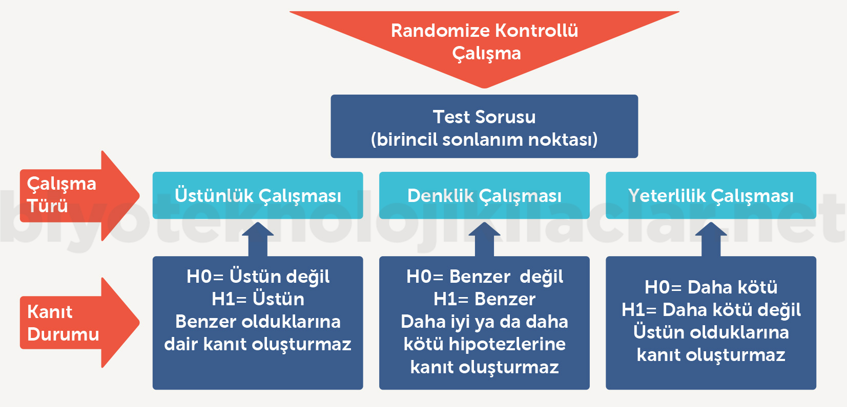 Bu çalışmaların yukarıda bahsedildiği üzere bir geçersizlik hipotezi bir de alternatif hipotezleri vardır. Çalışmaların sonucu bu iki hipotezden birinin kanıtını sağlar. Üçüncü bir hipoteze kanıt olarak değerlendirilemez. Örneğin üstünlük çalışmasının sonucunda kollar arasında fark olmaması kolların benzer sonuç gösterdiği şeklinde yorumlanamaz. Ya araştırılan kol üstündür (alternatif hipotez) ya da üstün değildir (geçersizlik hipotezi). Bu nedenle biyobenzer ilaçlara dair çalışmalar yeterlilik ve denklik çalışmalarıdır. Hem çalışma tasarımı açısından hem de üretilme gerekçeleri açısından üstünlük çalışmaları biyobenzer ilaçlar için yapılamaz (2,42-45,47,48).