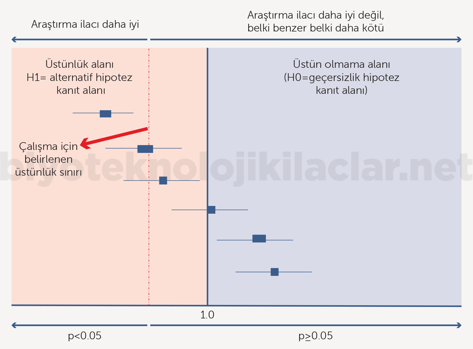 Üstünlük çalışmalarının geçersizlik hipotezi araştırma kolunun kontrol kolundan üstün olmadığıdır. Dolayısıyla çalışmada p değeri anlamlı anlamlı bulunursa alternatif hipotez kanıtlanır ve üstünlük durumu deklare edilir. Eğer p değeri anlamlı saptanamazsa o zaman geçersizlik hipotezi kanıtlanmış olur ve araştırma kolunun üstün olmadığı deklare edilir. Bu çalışmalarda kolların benzer olduğu sonucuna varılamaz ve deklare edilemez. Çünkü üstünlük sınırı belirlenmiş ve o sınırın üzerinde bir sonuç sağlanması hedeflenmiştir. Bu hedef sağlanamadığı takdirde üstünlük sınırından farklı olan ve benzerlik için gereken sınırların karşılanıp karşılanmayacağı bu çalışma tasarımı içinde belirsiz kalır ve kanıt oluşturulamaz. Denklik ya da benzerlik deklare edilemez. Dolayısıyla biyobenzer ilaçlar tüm geliştirme sürecinde referans ilaca benzer olmak amacıyla geliştirildiğinden üstünlük çalışması biyobenzer ilaçlar için uygun olamaz. Üstünlük çalışması ancak “biyoüstün” olma durumunda söz konusu olabilir (42-45,47).