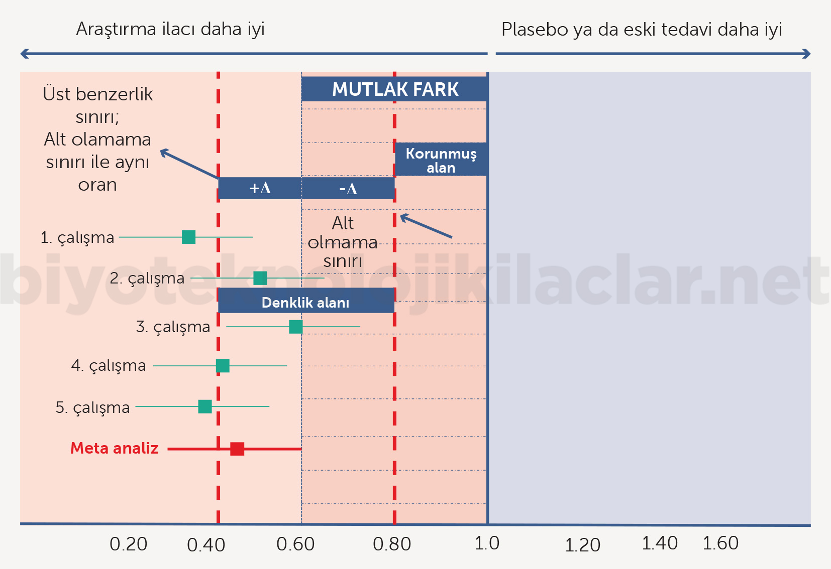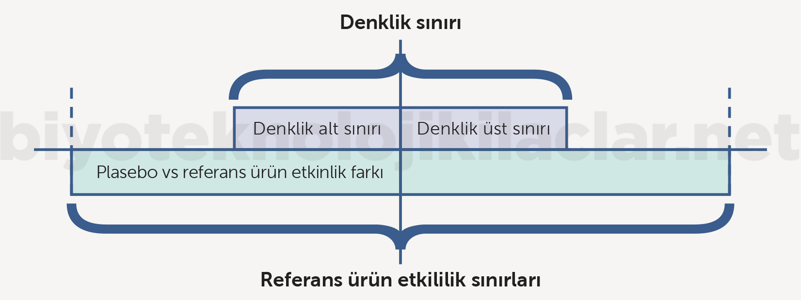 Mutlak etki farkı hesaplandıktan sonra genellikle ilgili otoriteyle görüşülerek mutlak etki farkının içinden bir denklik ya da yeterlilik sınırı belirlenir. Bu da genellikle mutlak etkinin %50-70 arasında bir sınıra denk gelecek şekilde oluşturulur (Şekil 13). Bununla birlikte denklik sınırı, her bir ilacın mutlak etki farkı düzeyi ve denklik çalışmasında kullanılan ilaçtan beklentilere göre otoriteyle tartışılarak oluşturulur. Biyobenzer ilaçlar için belirlenen denklik ya da alt sınır aralığı (Δ) klasik olarak denklik ve yeterlilik çalışmalarında uygulanan bu yöntemlerle belirlenir (Şekil 14). Denklik çalışmalarında yeterlilik çalışmalarından farklı olarak benzerliğin alt sınırı aynı zamanda üst sınır olarak da kullanılır (simetrik sınırlar). Doz ilişkili toksisiteler söz konusuysa veya kullanılan doz, doz-yanıt eğrisinde plato çizmeye yakın bir değer ve doz ilişkili yanıt farkı olasılığı küçükse üst sınır alt sınırdan farklı (asimetrik sınırlar) olabilir (42-48).
