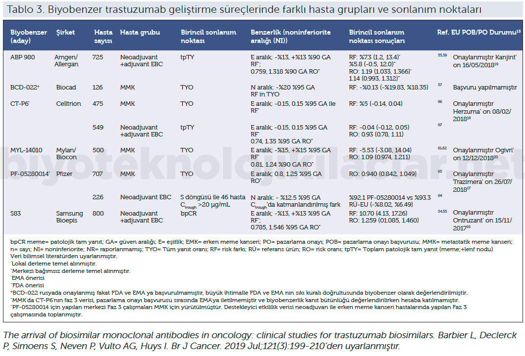 Homojen hasta popülasyonu tanımı farklı ilaçlarda daha tartışmalı olabilmektedir. Örneğin, EMA ve FDA biyobenzer trastuzumab için yanıt oranlarını değerlendirmede birinci basamak tedavi edilecek ileri evre meme kanserli hastaları hassas popülasyon olarak kabul etmektedir. Bununla beraber, onkoloji pratiğine oldukça yerleşmiş meme kanserinin neoadjuvan tedavisinde tam yanıt oranları da hassas birincil sonlanım noktası kabul edilmektedir (Tablo 3). Neoadjuvan tedavi alacak olan hastaların hastalık yükü ve süreci açısından daha homojen bir hasta grubu oluşturacağı ifade edilmektedir. Hassas homojen hastalık ve hasta grubu meme kanseri için bir tartışma olagelmekle birlikte, tüm biyobenzer trastuzumab geliştirme sürecinde ve metastatik hastalıkta heterojeniteyi minimize edecek çalışma tasarımı ve gücüyle biyobenzerliğin gösterilmesi için yeterli bilimsel kanıt ortaya konmaktadır (52).