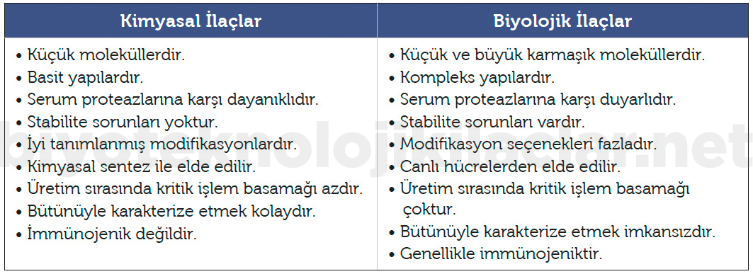 Tablo 2. Biyoteknolojik ilaçlar ile kimyasal ilaçlar arasındaki farklar