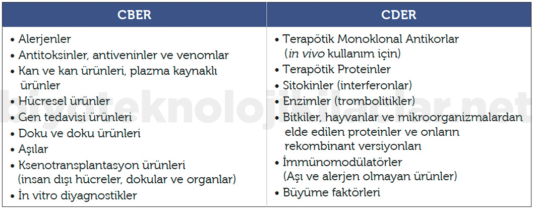FDA Halk Sağlığı Hizmeti Yasası’na göre (Bölüm 351) biyolojik ürün; bir hastalığı önlemek veya tedavi etmek üzere uygulanabilen virüs, terapötik serum, toksin, antitoksin, aşı, kan, kan ürünleri veya türevleri, alerjen ürün, protein (kimyasal olarak sentezlenen polipeptitler hariç) veya analog ürünlerdir. Biyolojik ürünler FDA’da ‘İlaç Değerlendirme ve Araştırma Merkezi’ (CDER) ve ‘Biyolojik Ürünler Değerlendirme ve Araştırma Merkezi’ (CBER) olmak üzere iki merkez tarafından değerlendirilmektedir (13). FDA’da CBER ve CDER kapsamında değerlendirilen biyolojik ürünler Tablo 3’te belirtilmiştir (14,15).